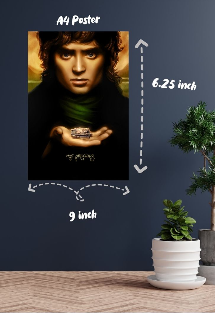 Embark on a journey to Middle-earth with Posterwa's captivating Frodo Baggins poster! Transport yourself to the enchanting landscapes of the Shire and beyond as you follow Frodo's epic quest to destroy the One Ring. Printed on glossy 300 GSM Gold Coin Paper with the highest quality printer, this poster brings every detail of Frodo's adventure to life, from the rugged terrain to the shimmering elven realms. Whether you're a seasoned Tolkien fan or discovering the magic of Middle-earth for the first time, this poster is a must-have addition to your fandom collection. Let Frodo's courage and determination inspire you on your own heroic quest!