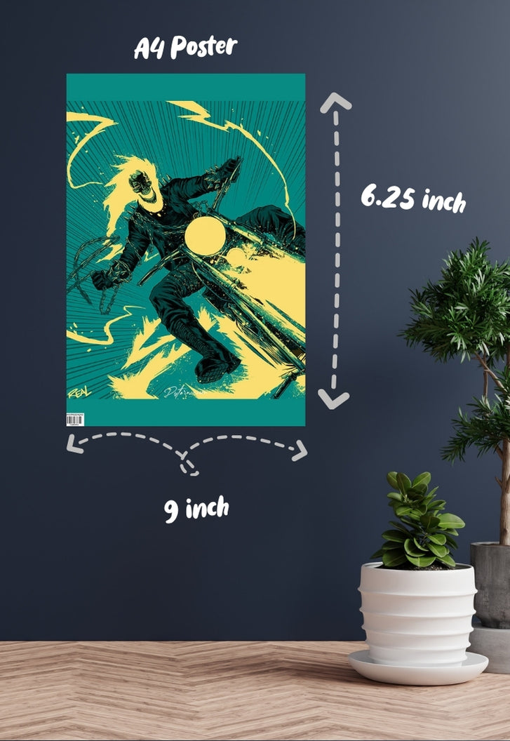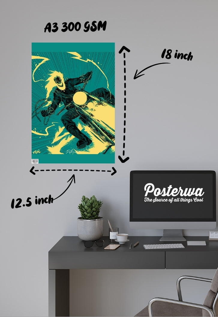 **Feel the blazing thrill of the Ghost Rider's ride!** Our Ghost Rider Bike poster from "Posterwa" captures the fiery essence of this iconic antihero, perfect for fans seeking adrenaline-fueled décor. Printed on glossy 300 GSM Gold Coin Paper with unparalleled detail, this poster brings the Ghost Rider's blazing presence to life. Whether you're a die-hard fan or a newcomer to the supernatural world of Marvel, this poster is a must-have addition to your collection. Embrace the flames and let the Ghost Rider's power ignite your passion for the darker side of the Marvel Universe.