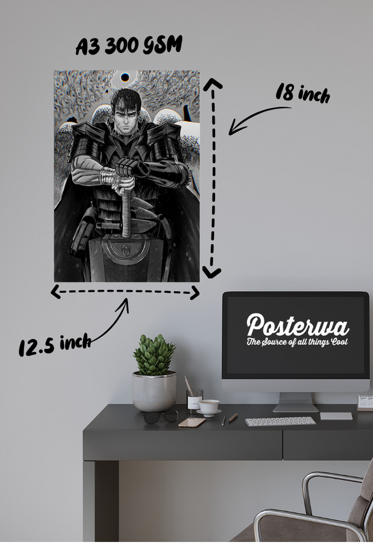 Immerse yourself in the epic world of Berserk with our Guts poster from Posterwa! This stunning artwork captures Guts in all his fierce glory, wielding his iconic Dragonslayer sword amidst a backdrop of dark, brooding fantasy. Printed on glossy 300 GSM Gold Coin Paper with our top-of-the-line printer, every detail, from Guts' determined gaze to the intricate armour, is brought to life with breath taking clarity. Perfect for fans of the Berserk series, this poster is a must-have addition to your collection, bridging the gap between you and the intense, dark beauty of this beloved fandom.