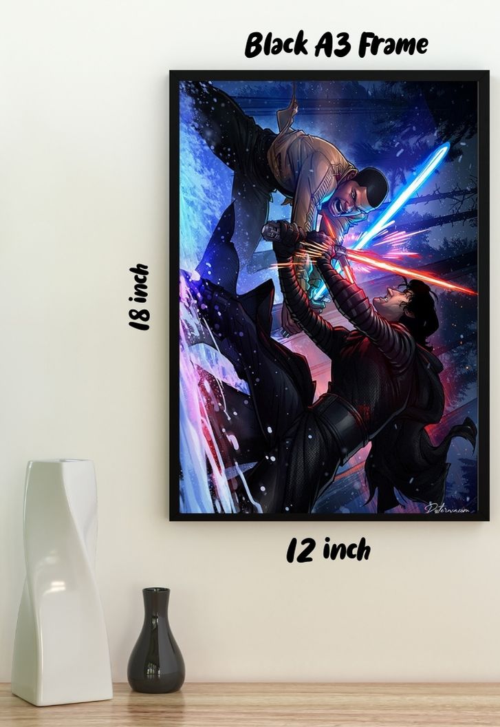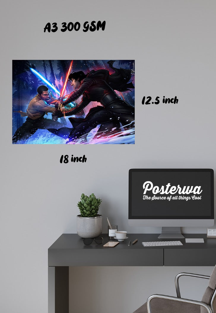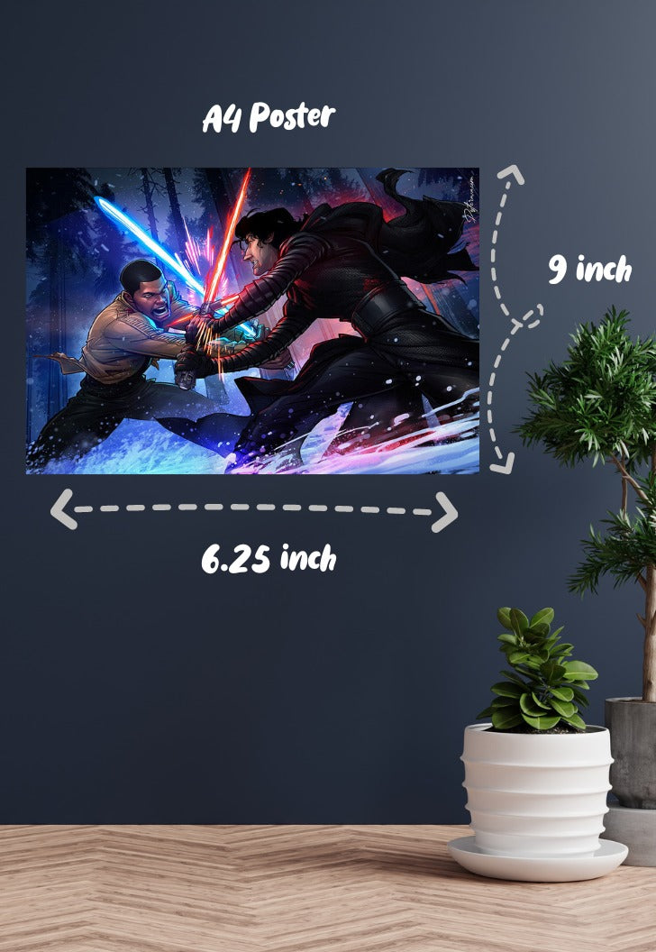 Dive into the heart-pounding clash between Kylo Ren and Finn with Posterwa's electrifying poster! Witness the epic duel of light and dark, as these iconic characters from your favourite fandom collide in a battle for the ages. Printed on glossy 300 GSM Gold Coin Paper with the utmost precision, every detail of this masterpiece shines with intensity. Feel the Force surge through the vibrant colours and dynamic composition, immersing you in the epic saga like never before. Whether you stand with the Resistance or embrace the power of the First Order, this poster captures the essence of fandom passion and adventure. Take your place in the galaxy's epic struggle—Kylo Ren vs Finn awaits!