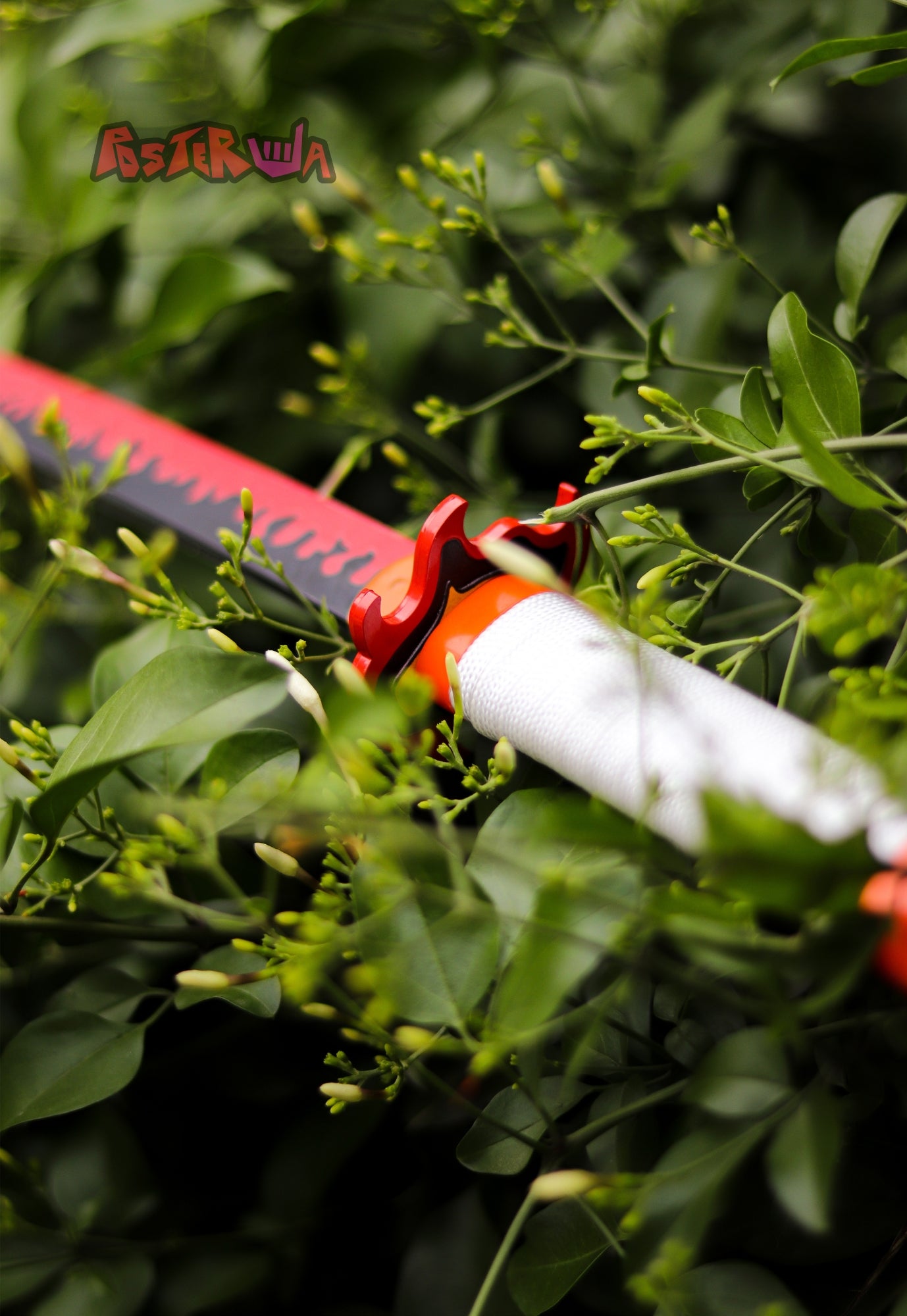 True-to-Anime Detailing – Black spine with a scorched-scarlet hamon, crisp 「惡鬼滅殺」 engraving, and that unmistakable flame-shaped tsuba in molten orange-red.