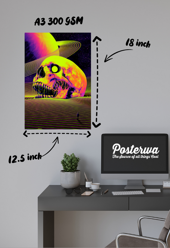 Step into the dark allure of the Skull Terror Universe with this mesmerizing poster. Dive deep into a realm where shadows dance with cosmic horrors, each detail etched with the precision of fandom devotion. Embrace the chilling beauty of this artwork as it brings to life the essence of fear and fascination. Printed on glossy 300 GSM Gold Coin Paper, every line and curve is accentuated, immersing you in a world where terror meets artistry. Perfect for fans seeking a touch of darkness in their collection, this poster from Posterwa embodies the spirit of fandom with unparalleled quality.