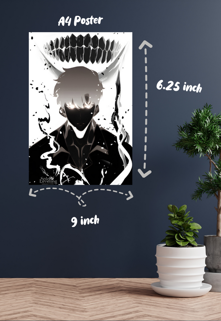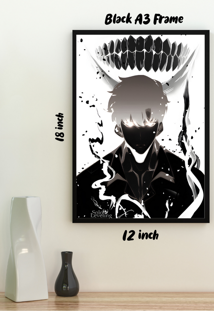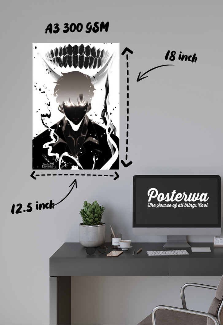 Step into the monochrome world of Solo Leveling with this captivating poster from Posterwa. Dive into the depths of this fandom as shadows and light intertwine, depicting the essence of Jin-Woo's journey. The intricate details and stark contrasts bring the characters to life, making every glance a new adventure. Printed on glossy 300 GSM Gold Coin Paper, this poster ensures premium quality that captures every nuance of the monochrome aesthetic. Elevate your space and showcase your love for Solo Leveling with this striking addition to your collection.